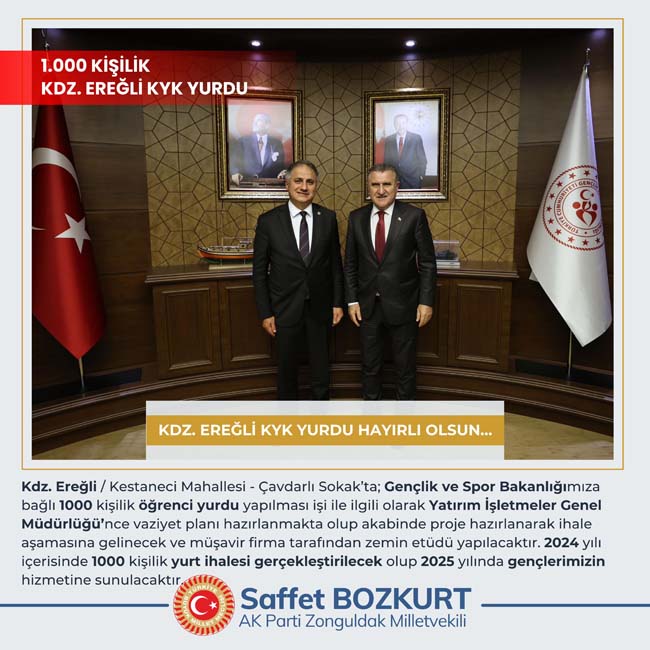“Kdz. Ereğli / Kestaneci Mahallesi - Çavdarlı Sokak’ta; Gençlik ve Spor Bakanlığımıza bağlı 1000 kişilik öğrenci yurdu yapılması işi ile ilgili olarak Yatırım İşletmeler Genel Müdürlüğü’nce vaziyet planı hazırlanmakta olup akabinde proje hazırlanarak ihale aşamasına gelinecek ve müşavir firma tarafından zemin etüdü yapılacaktır. 2024 yılı içerisinde 1000 kişilik yurt ihalesi gerçekleştirilecek olup 2025 yılında gençlerimizin hizmetine sunulacaktır.” dedi