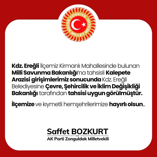 “Kdz. Ereğli İlçemiz Kirmanlı Mahallesinde bulunan Milli Savunma Bakanlığı’na tahsisli Kaletepe Arazisi girişimlerimiz sonucunda Kdz. Ereğli Belediyesine Çevre, Şehircilik ve İklim Değişikliği Bakanlığı tarafından tahsisi uygun görülmüştür. İlçemize ve kıymetli hemşerilerimize hayırlı olsun.” dedi