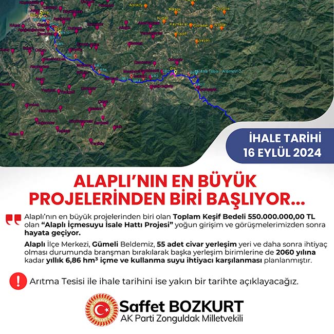 “Alaplı’nın en büyük projelerinden biri olan Toplam Keşif Bedeli 550.000.000,00 TL olan “Alaplı İçmesuyu İsale Hattı Projesi” yoğun girişim ve görüşmelerimizden sonra hayata geçiyor. İHALE TARİHİ 16 EYLÜL 2024