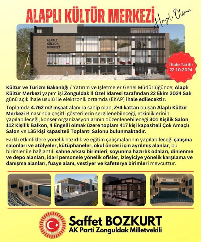 AK Parti Zonguldak Milletvekili Saffet Bozkurt, , Alaplı Kültür Merkezi yaoım işinin ihaleye çıkacağını duyurdu.
