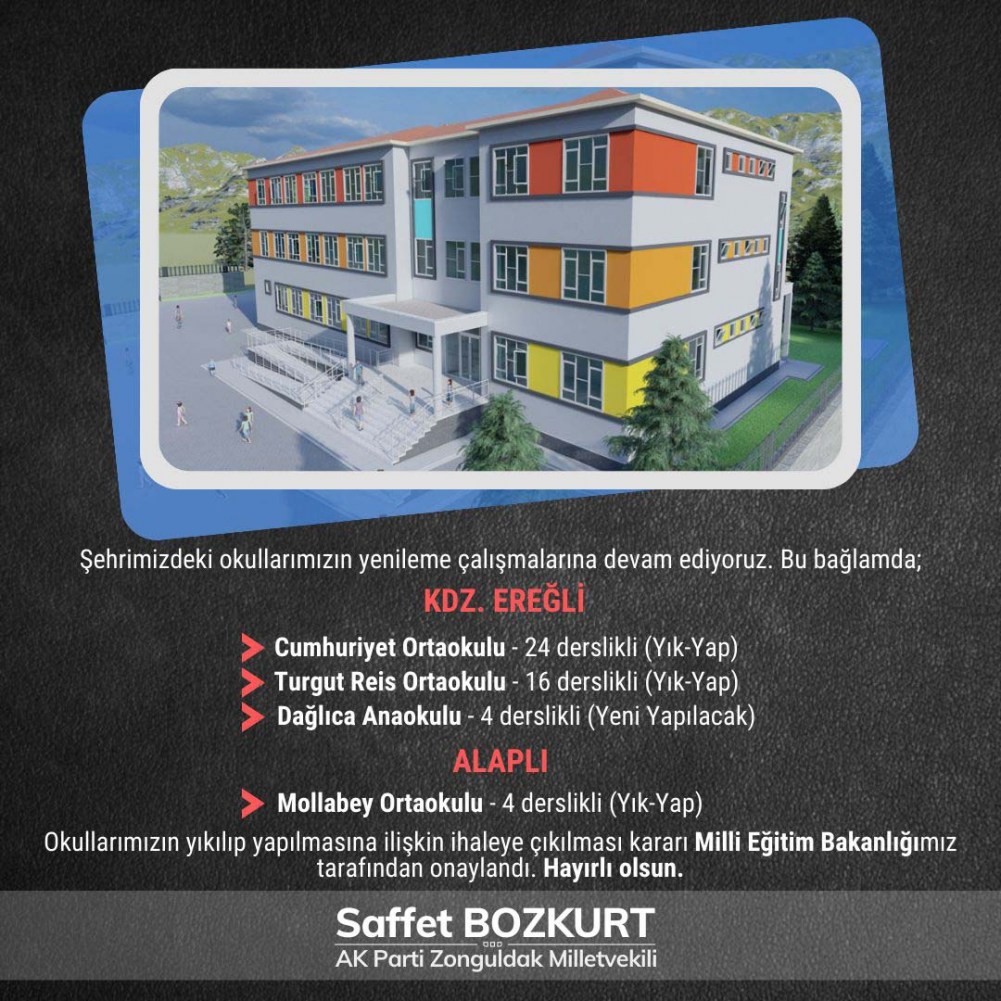 AK Parti Zonguldak Milletvekili Av. Saffet Bozkurt, ilçedeki bazı okulların yıkılıp yeniden yapılması doğrultusunda Milli Eğitim Bakanlığı tarafından onay verildiğini açıklamasında, “Eğitim için yapılan her bir yatırımın ülkemizin geleceğine yapılmış en büyük yatırım olarak değerlendiriyoruz. Şehrimizdeki bazı okullarımızın yıkılıp yeniden yapılmasına ilişkin ihaleye çıkılması kararı Milli Eğitim Bakanlığımız tarafından onaylandı. İlçemiz Kandilli beldesinde bulunan Kandilli Stadı yapılan yatırımın ardından gece maçlarına ve antrenmanlara da elverişli hale getirildi”