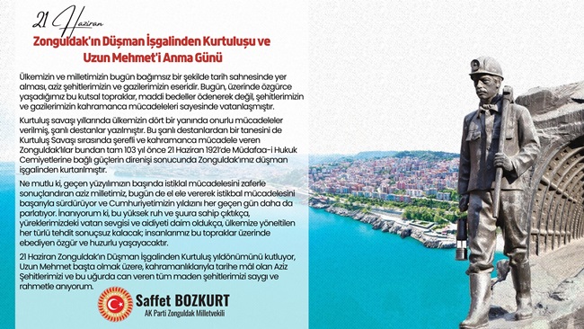21 Haziran Zonguldak’ın Düşman İşgalinden Kurtuluş yıldönümünü kutluyor, Uzun Mehmet başta olmak üzere, kahramanlıklarıyla tarihe mâl olan Aziz Şehitlerimizi ve bu uğurda can veren tüm maden şehitlerimizi saygı ve rahmetle anıyorum.”