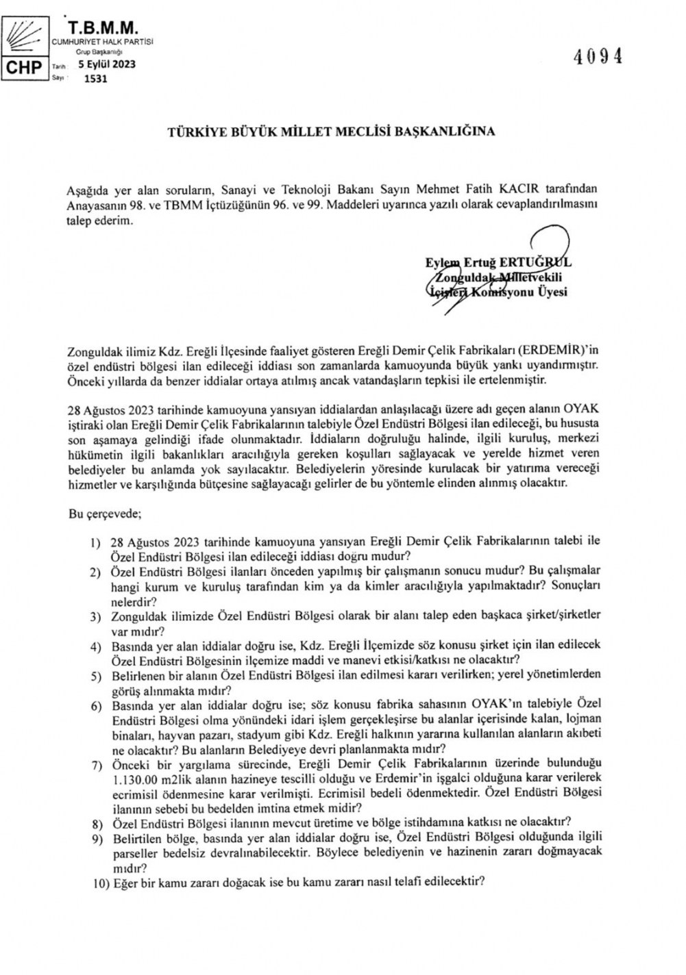 “28 Ağustos 2023 tarihinde kamuoyuna OYAK iştiraki olan Ereğli Demir Çelik Fabrikalarının Özel Endüstri Bölgesi ilan edileceği, bu hususta son aşamaya gelindiği ifade edilmişti. Bu konuyu meclis gündemine taşıdık. Benim bu konuya tepkim yeni de değil. Bu iddialar önceki yıllarda da ortaya atıldı. Kamuoyu tepkisi ile ertelene ertelene bu günlere getirdik. O dönemde ilçe başkanıydım. Erdemir’in Özel Endüstri Bölgesi kapsamına alınma konusunda iktidar partisinin Zonguldak Milletvekillerinin, Ereğli halkından habersiz biçimde pazarlıklar içinde olmasını, bu kent halkına yapılmış bir saygısızlık olarak kabul ettiğimi söylemiştim yine söylüyorum. Bizler bir konuyla ilgili çalışmayı, söylenecek sözleri, yapılacak görüşmeleri titizlikle temsil ettiğimiz yörenin hassasiyetlerine göre yürütürken birileri kapalı kapılar ardında kendi menfaatlerine göre pazarlıklarını yürütüyor.