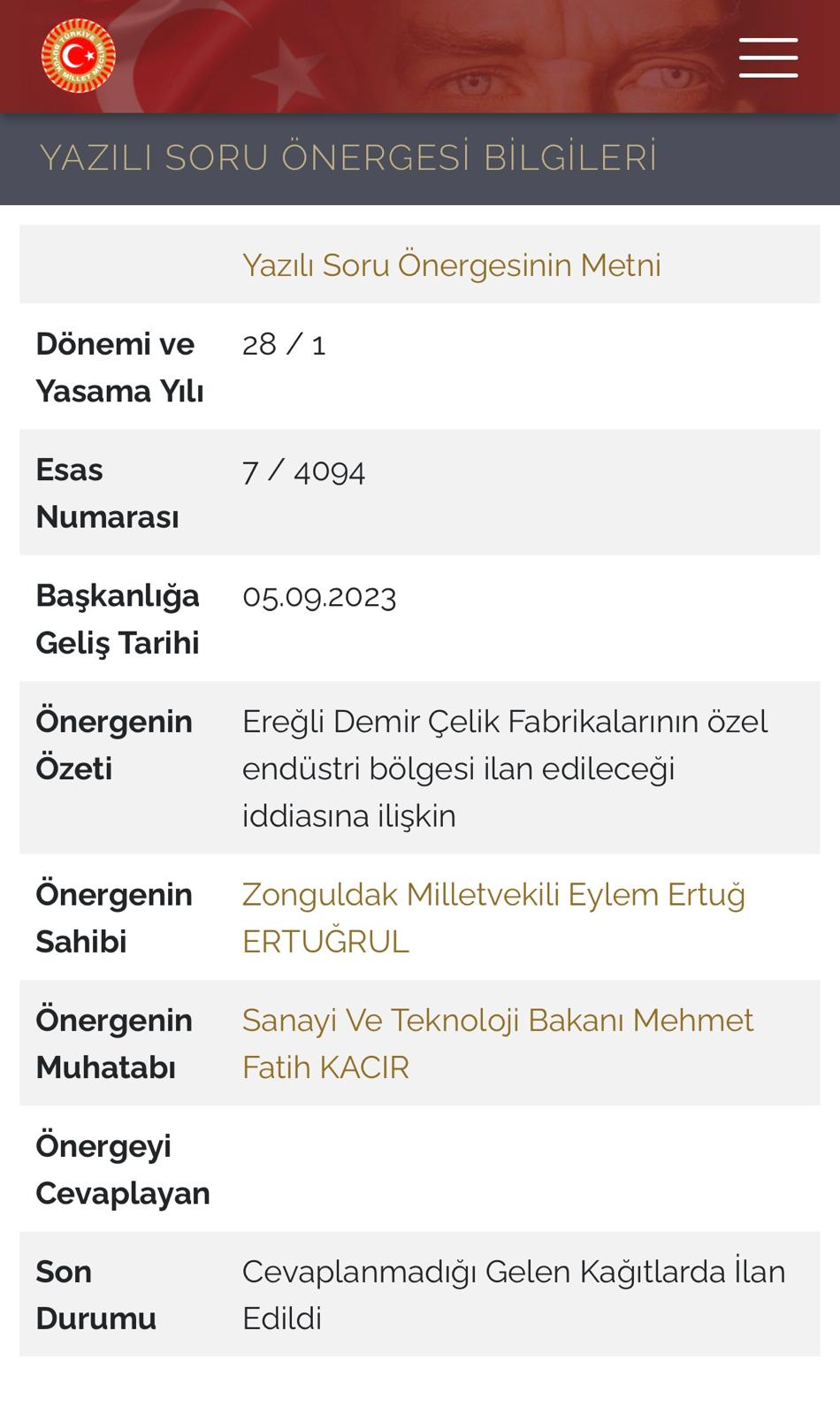 Ertuğrul, verilen kararın Kdz. Ereğli’nin ekonomisine ve doğasına zarar verdiğini belirtti ve sürecin hukuksuz olduğunu ifade etti. Bir gecede yayınlanan bir kararla, tek adam, “ben istedim, karar verdim ve oldu” dedi ve Erdemir’in tüm tepkilere rağmen özel endüstri bölgesi ilan etti!” dedi.