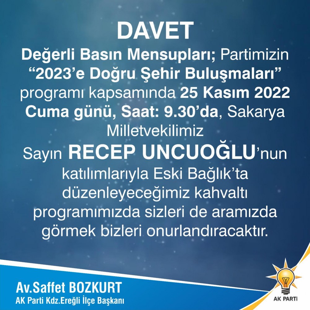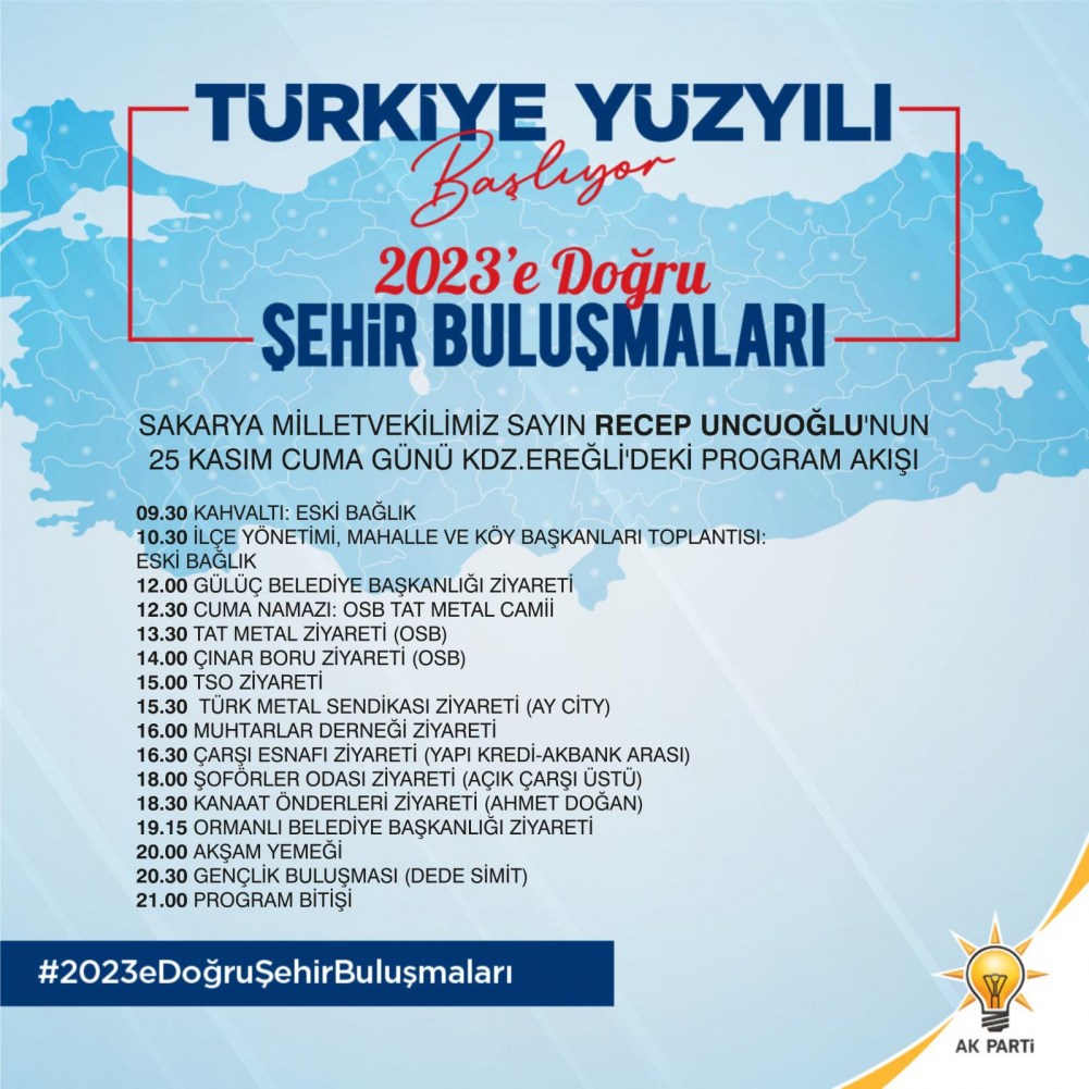 Adalet ve Kalkınma Partisi (AK Parti) Genel Merkezi tarafından düzenlenen “2023’e Doğru Şehir Buluşmaları” programı kapsamında, AK Parti Sakarya Milletvekili Recep Uncuoğlu 25 Kasım 2022 Cuma günü Kdz. Ereğli’ye gelecek.