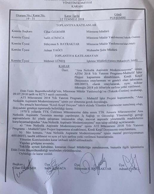 CHP’li Milletvekilinin paylaştığı 12.07.2018 tarihli başka bir belgede ise yetersiz olan havalandırma aspiratörünün değiştirilmesi için TTK yönetim kurulunca karar alındığı ancak faciaya kadar geçen 4 yıl 3 aylık süre boyunca aspiratörün tedarik edilmediği anlaşılıyor.