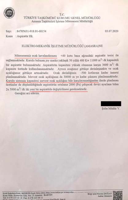 Yavuzyılmaz’ın kamuoyuyla paylaştığı 03.07.2020 tarihli TTK kurum içi yazışma belgesinde, kazanın yaşandığı ocakta bulunan aspiratörün 50 yıllık olduğu, aspiratörün kapasitesinin mevcut ocak açıklığını bile karşılayamadığı bu nedenle yeni bir aspiratörle değiştirilmesi gerektiği’ belirtiliyor.