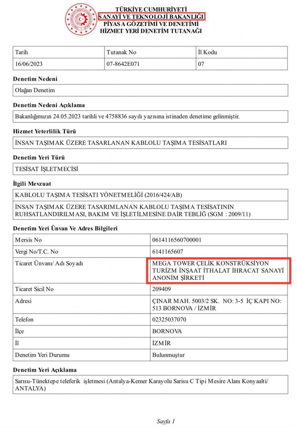 Cumhuriyet Halk Partisi (CHP) Genel Başkan Yardımcısı ve Zonguldak Milletvekili Deniz Yavuzyılmaz’ın sosyal medya hesabı X üzerinden yayınladığı belge ile Bakanlığın, tesisat bakımını yapan Mega Tower Çelik Konstrüksiyon Tur. İnş. İth. İhr. San. A.Ş isimli şirketin bakım, ayar, işletme, personel yeterlilik, kurtarma talimatlarına ve bakım çizergelerine uygunluk gibi bütün denetim kalemlerine uygunluk vermiş olmasına dikkat çekti.