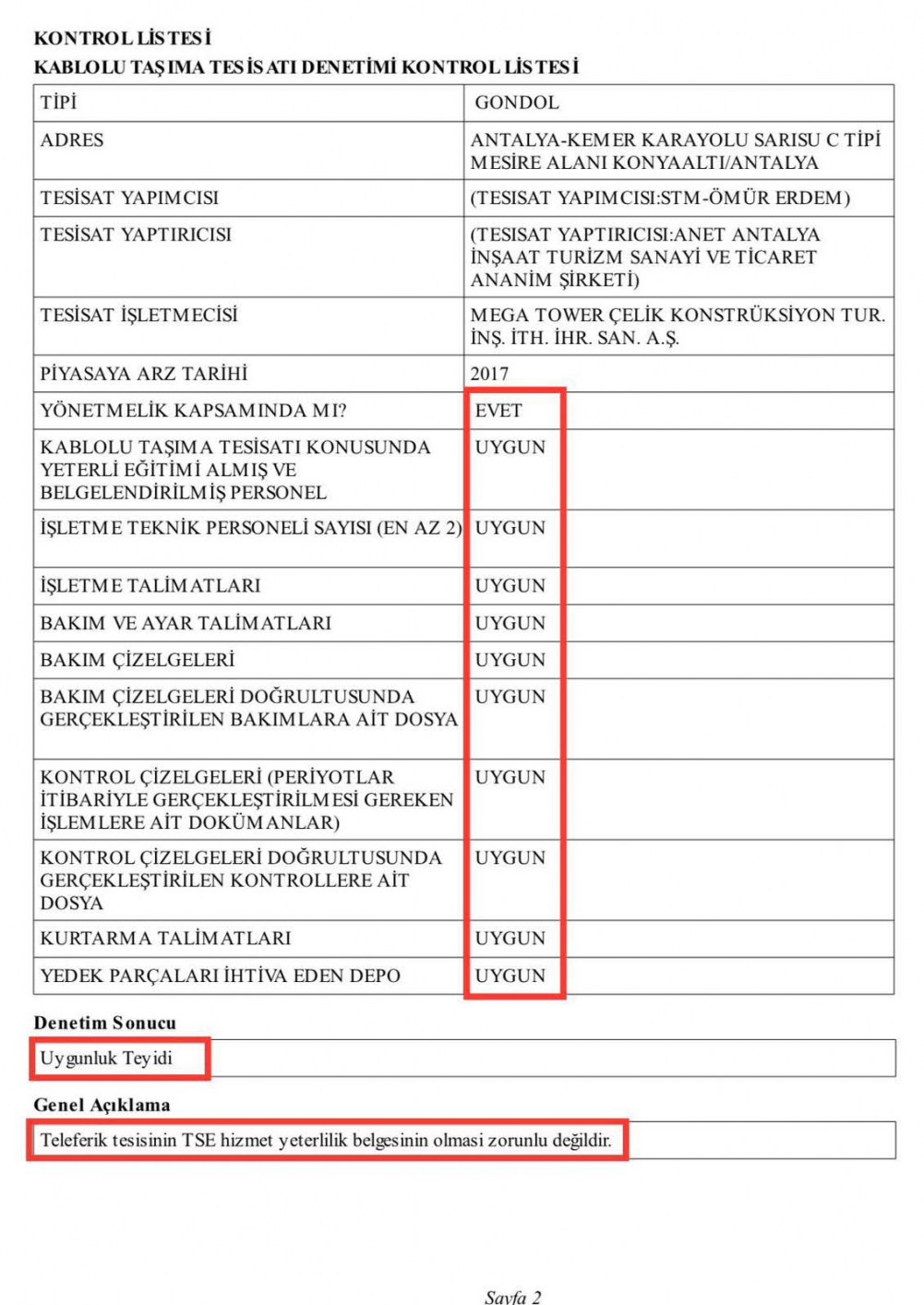 Yavuzyılmaz, teleferik kazasının tesisinin bakımını yapan şirkete Sanayi ve Teknoloji Bakanlığı tarafından verilen uygunluk belgesini kamuoyu ile paylaştı.