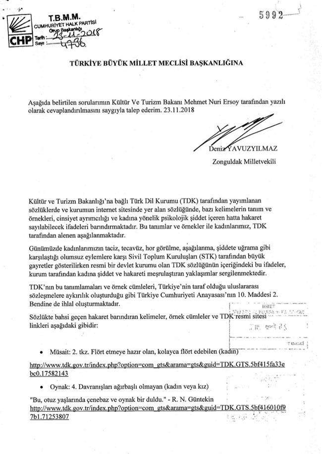Cumhuriyet Halk Partisi (CHP) Zonguldak Milletvekili Deniz Yavuzyılmaz, Türk Dil Kurumunun (TDK) geçtiğimiz günlerde sözlüklerinde güncelleme yaptığını ve kadını aşağılayan içeriklerin sözlükten kaldırıldığını açıkladı.