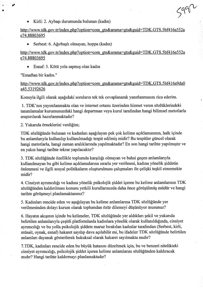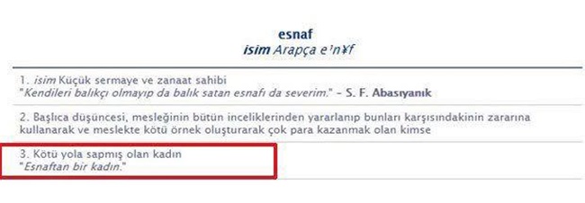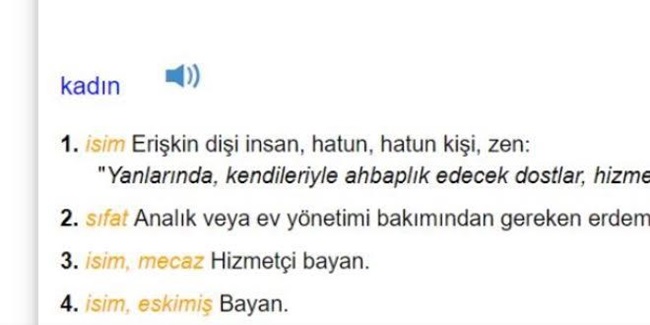 “Türk Dil Kurumu, TDK sözlüğünde yer alan: kadın, müsait, serbest, kirli, esnaf, oynak gibi kelimelerin anlam karşılığındaki kadını aşağılayan içerikleri nihayet kaldırıldı.