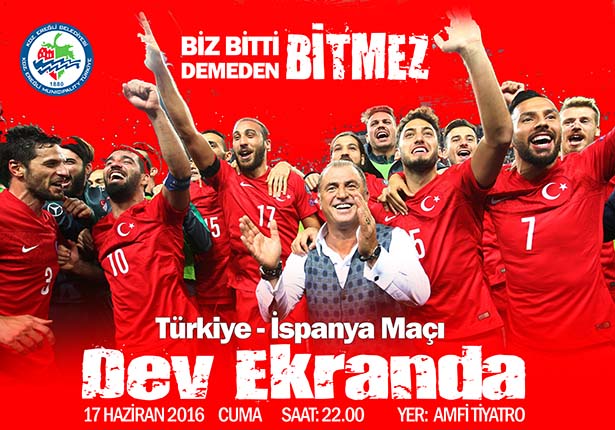 Avrupa Şampiyonası, "EURO 2016" ya 1-0'lık Hırvatistan yenilgisi ile başlayan Türk Milli Takımının şampiyona kapsamında 17 Haziran Cuma günü oynayacağı İspanya maçı, saat 22.00'dan itibaren Amfi Tiyatroya kurulacak dev ekrandan izlenebilecek.