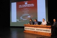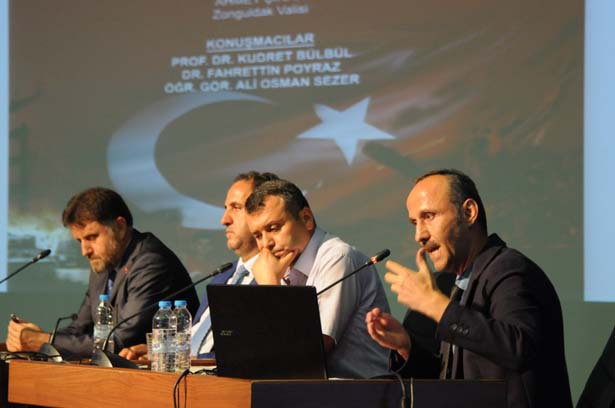 Protokol konuşmalarının ardından Doç. Dr. Hasan Meydan'ın moderatörlüğünde panele geçildi. Konuk konuşmacılardan ilk olarak Prof. Dr. Kudret Bülbül kürsüye çıktı. Bülbül, 15 Temmuz demokrasi şehitlerini anarak ve böyle anlamlı bir anma programının Zonguldak Bülent Ecevit Üniversitesi'nde yapılmasının kendisi içinde ayrı bir değer taşıdığını vurgulayarak başladığı konuşmasında, "FETÖ bir küresel işgal hareketidir. Sadece Türkiye için değil, tüm dünyada tehdit oluşturan bir terör örgütüdür. FETÖ'nün Türkiye'de üretilen bir terör örgütü olmasının en büyük nedeni Türkiye'nin tarihiyle, potansiyeliyle ve imkânlarıyla bugün ve gelecekte insanlığın sorunlarına cevap verebilecek nadir ülkelerden bir olmasındandır. Türkiye medeniyet sınırları, siyasal sınırları fersah fersah aşan güçlü bir ülkedir. Türkiye, diğer dünya ülkelerinde olmayan üç temel unsurun, adalet, paylaşım ve birlikte yaşamanın bir arada olduğu nadir ülkelerden biri olduğu için rahat bırakılmamaktadır. 15 Temmuz hain darbe girişimi Türkiye'deki bu üç unsurun bölünmesi için yapılmıştır. Ancak, Türk Milleti 15 Temmuz gecesi gösterdiği kahramanca direnişle bu hain terör hareketini bertaraf etmiştir. Peki, FETÖ hala bir tehdit midir? Evet, FETÖ hala içimizde başsız bir canlı bomba gibi dolaşmaktadır. FETÖ, cemaat ya da bir sivil toplum örgütü değildir. FETÖ, her türlü mekanizmayı bize karşı kullanan, olduğu gibi görünmeyen, göründüğü gibi olmayan tamamen bizim zaaflarımızı, kutsallarımızı hedef alarak küresel bir hegemonya kurmayı amaçlayan bir hain terör örgütüdür." diye konuştu.