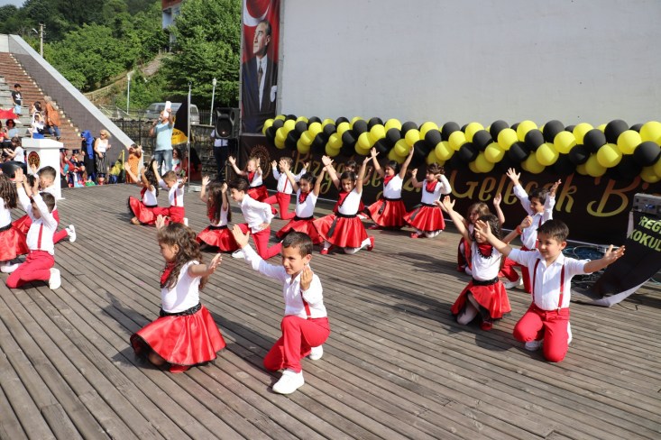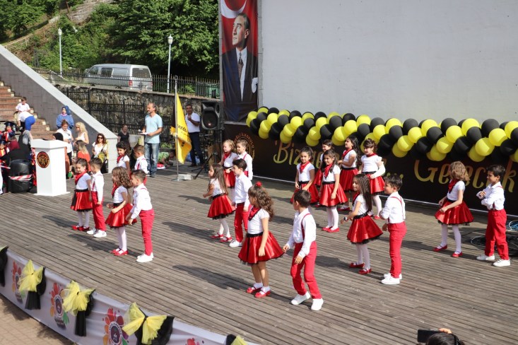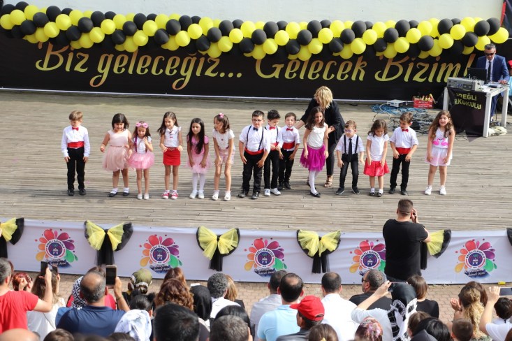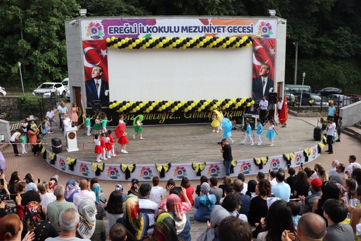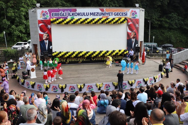 Zonguldak'ın Ereğli ilçesi Ereğli İlkokulu Ana sınıfı öğrencileri, düzenlenen mezuniyet etkinliğinde yaptıkları gösterilerle alkışları topladı. Öğrenciler gösterilerinin ardından karnelerini Okul Müdürü Tuncay Uzun ve Müdür yardımcılarının elinden aldılar.