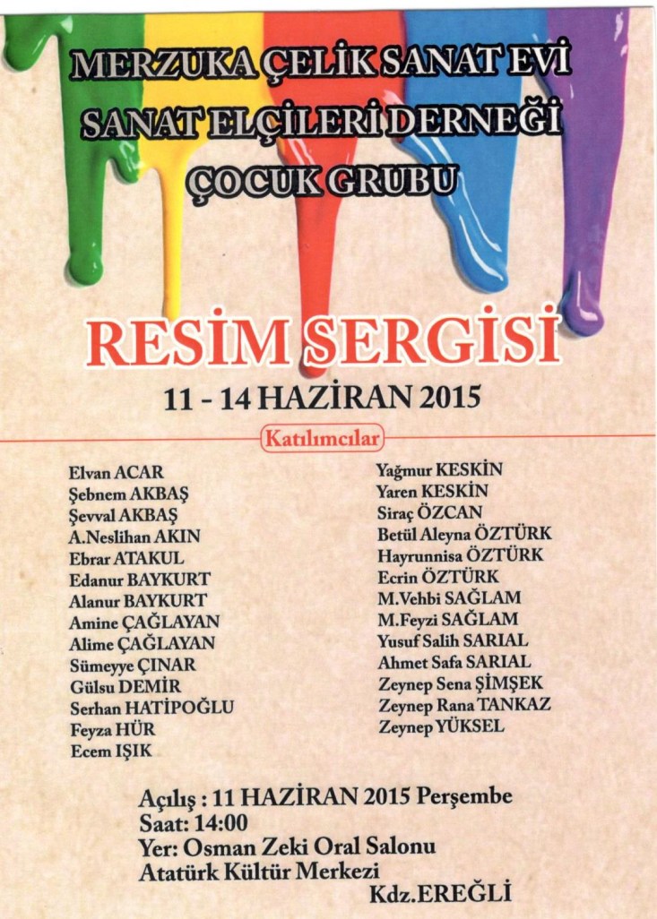 Merzuka Çelik Sanat evi Sanat Elçileri Derneği Çocuk Grubu Resim Sergisi açılacak.