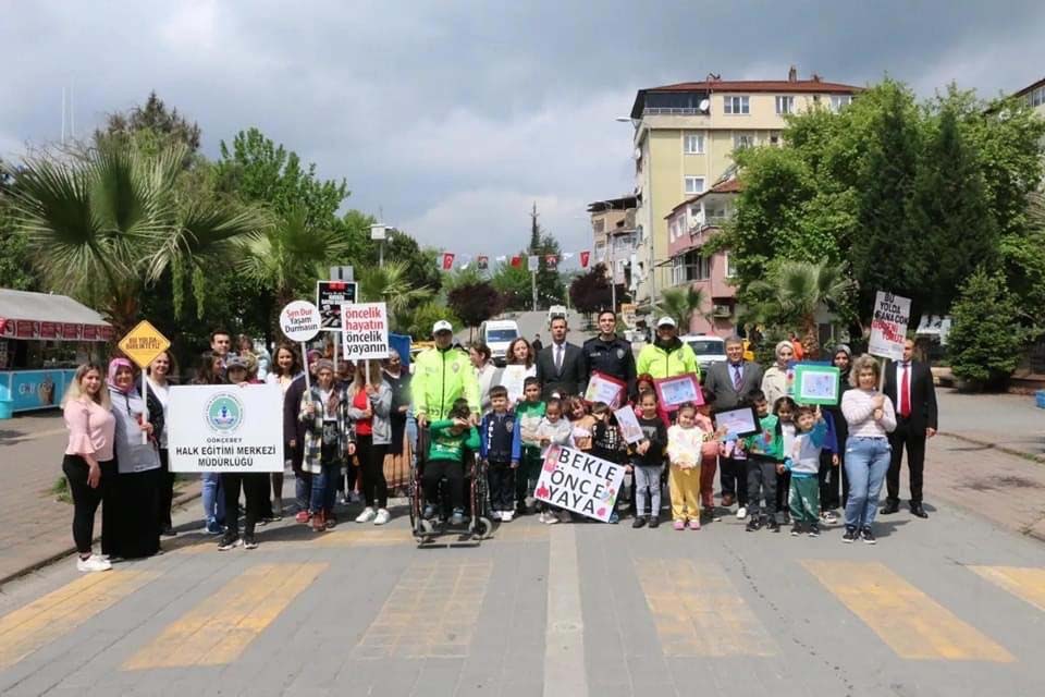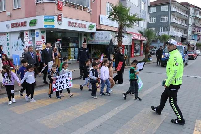 Gökçebey Kaymakamı Emrah Aslan, Trafik Haftası etkinlikleri kapsamında minik öğrencilerle yaya geçitlerinde trafik uygulaması gerçekleştirdi.