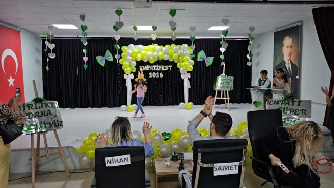 Okulun rehberlik servisi tarafından spor salonunda organize edilen etkinlikte, öğrenciler kendi elleriyle tasarladıkları "empati şapkalarını" takarak sahneye çıktı. Arkadaşlarının farklılıklarını görebilmek ve onların duygularını daha iyi anlayabilmek amacıyla tasarlanan şapkalar, üretkenlikte sınır tanımadı. Minik öğrenciler şapkalarını oyuncak, şeker, ponpon, toka gibi çeşitli eşyalarla süsleyerek okul bahçesinde rengarenk bir atmosfer oluşturdu.
