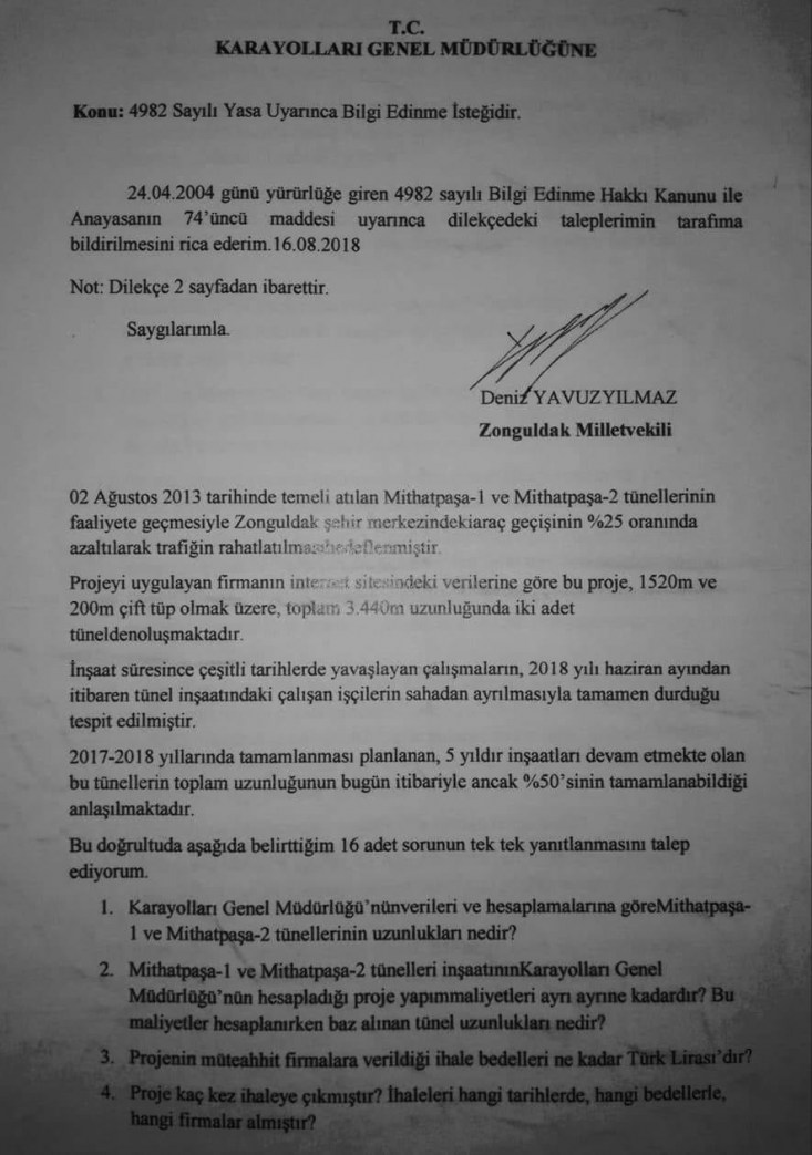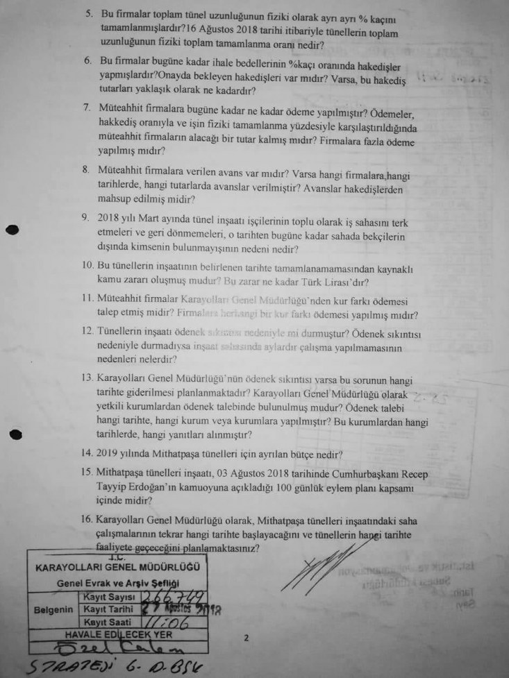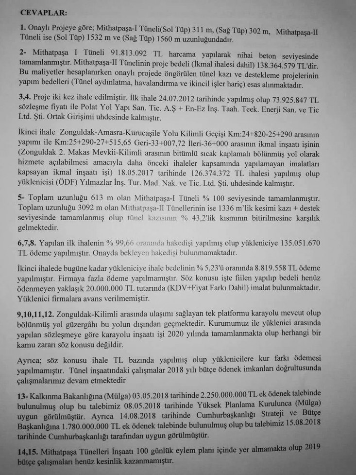 Milletvekili, 16 Ağustos tarihinde Mithatpaşa Tünellerinin akıbetiyle ilgili olarak sunduğu 16 sorudan oluşan Bilgi Edinim dilekçesine 11 Eylül tarihi itibariyle bölge müdürlüğünce verilen yanıtları da dün sosyal medya hesaplarından yayınlayarak kamuoyuyla paylaştı.