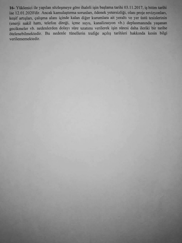 KGM bu soruya verdiği yanıtla, 6 aydır çalışmaların durduğu Mithatpaşa Tünelleri inşaatının, 100 günlük eylem planı içinde yer almadığı belirtti.