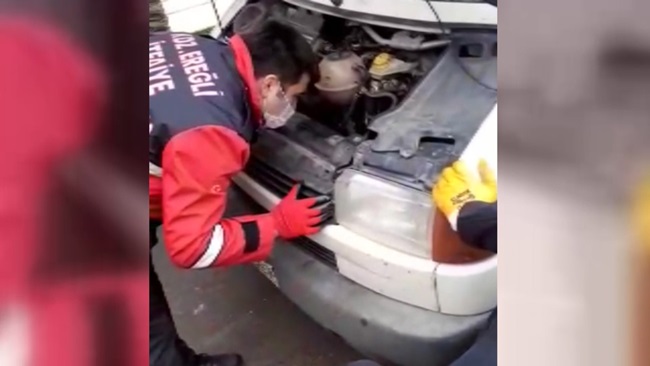 Zonguldak’ın Ereğli ilçesinde hafif ticari kamyonetin motor kısmına giren kedi, İtfaiye ve Zabıta ekiplerinin yaklaşık 10 dakika süren çalışmasının ardından çıkarıldı. İtfaiye ekipleri tarafından koruma altına alınan kedi tedavi ve bakımları için Ereğli Belediyesine bağlı hayvan barınağına götürüldü. Motora giren kedi, internetten açılan kedi sesi ile çıkarıldı.