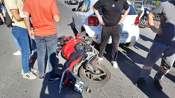 Zonguldak'ın Ereğli ilçesinde motosiklet ile otomobil çarpışırken, motosiklet sürücüsü kazayı hafif sıyrıklarla atlattı.