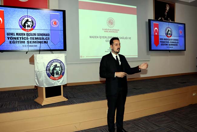 Genel Başkan Yeşil’in konuşmasının ardından Ankara Yıldırım Beyazıt Üniversitesi Öğretim Üyesi Tarkan Zengin, ‘Türkiye’de sendikalar ve sendikal kavramlar’ konulu seminer verdi. Ardından ise Çalışma ve Sosyal Güvenlik Bakanlığı Çalışma Uzmanı Yüksek Maden Mühendisi Berk Atalı, “Madenlerde İş Sağlığı ve Güvenliği Önlemleri-Güvenlik Kültürü” konulu sunumunu gerçekleştirdi. Program sonunda GMİS Genel Başkanı Hakan Yeşil, Atalı’ya madenci heykeli takdim etti.