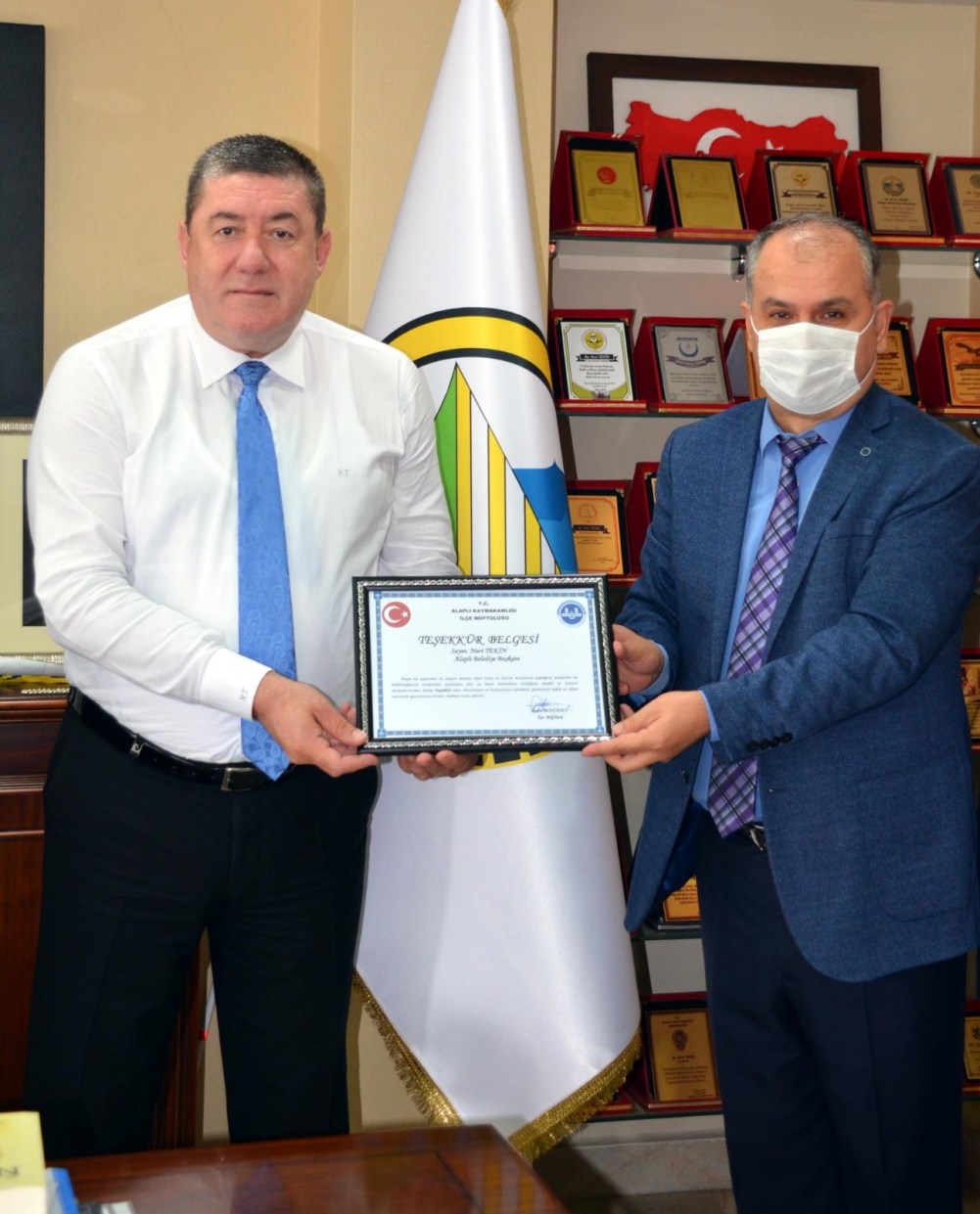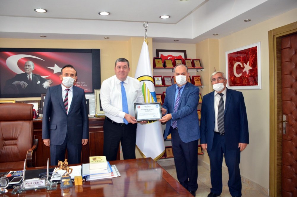 Cami ve Kur’an Kurslarına verdiği maddi ve manevi destekten dolayı Başkan Tekin’e teşekkür eden Müftü Bostancı, ‘Teşekkür Belgesi’ verdi.