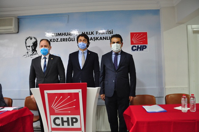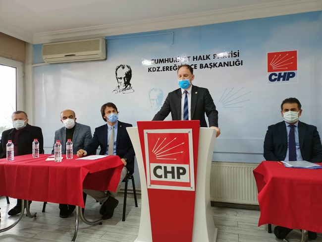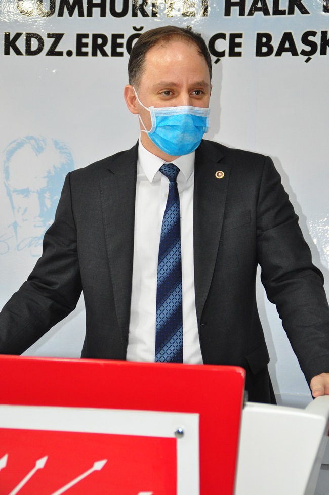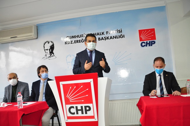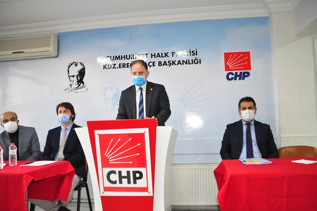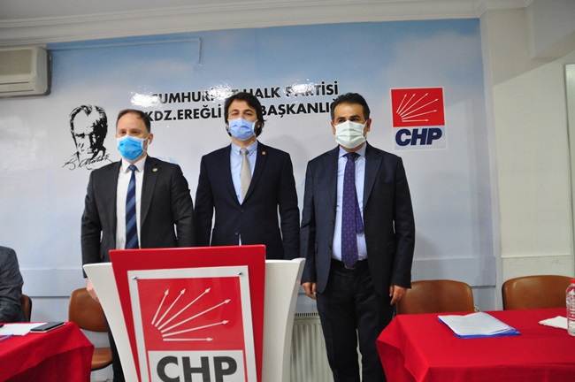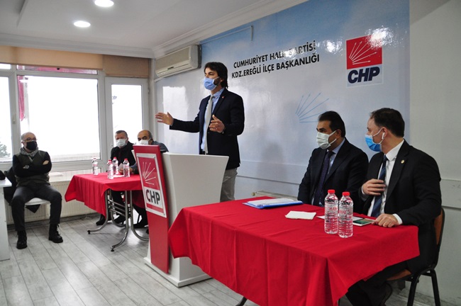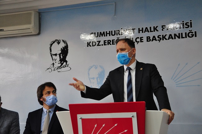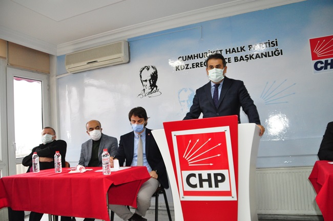 “Ereğli’de bir kamu binasının yapımı, fikrin ortaya çıkması, tartışılması, projelendirilmesi, adım olarak hayata geçirmek, ihale yapmak ve bitirilmesi çok zaman alıyor. PTT Binasını neredeyse yedi yıldır konuşuldu o müteahhit aldı, bu müteahhit aldı derken yedi yıllık bir süreçte tamamlandı. Belediye binamız yıkıldı, geçici süre öbür tarafa gidildi, orası öyle kaldı. Kaymakamlık binamız yıkıldı, geçici olarak bir hizmet binasında. Bir kaymakamlık binası yok. Emniyet müdürlüğü aynı şekilde binamız yıkıldı, ortada yeni bir bina yok. Dolayısıyla kamu binaları ve kamu hizmetleriyle ilgili Ereğli ilçemiz zamanı uzatarak, gecikerek bu hizmetlere ulaşabiliyor. Burada bir yanlış söz konusu. Bunu düzeltmemiz lazım. Derhal Belediye binası, Kaymakamlık Binası, Emniyet binasının derhal kaymakamlık binası için bir an önce projelendirip kaynak aktarılmalı ve yapılmalı. Şu devirde kaymakamlık binası olmayan başka bir ilçe yoktur diye düşünüyorum. Burada bir eksiklik, aksaklık var. Burada iktidar partisine büyük bir sorumluluk düşüyor. Eğer yapamıyorlarsa, Alemdar Gemisi’nde olduğu gibi ilgili bakanlarla hep birlikte görüşmeye hazırız.”