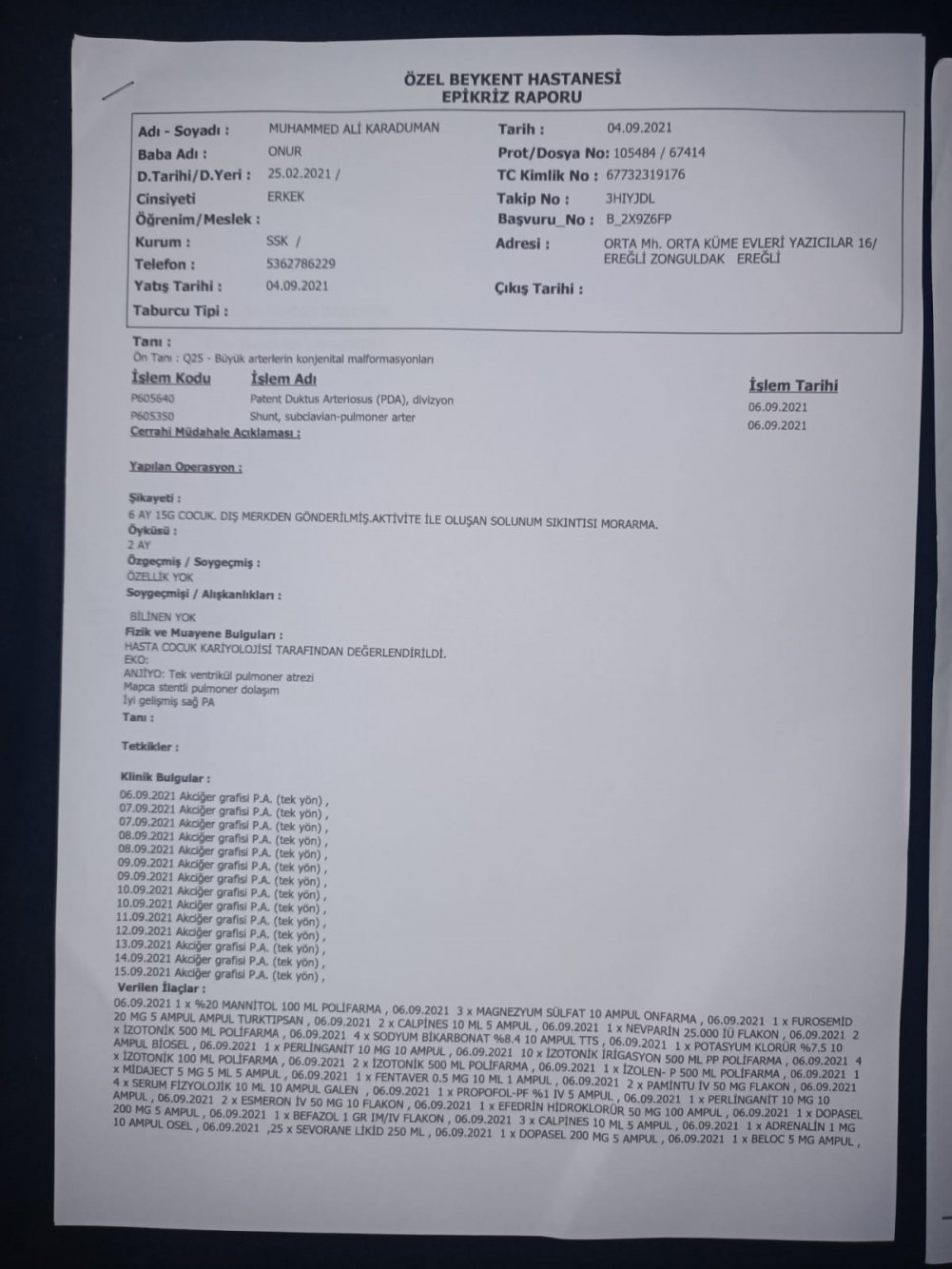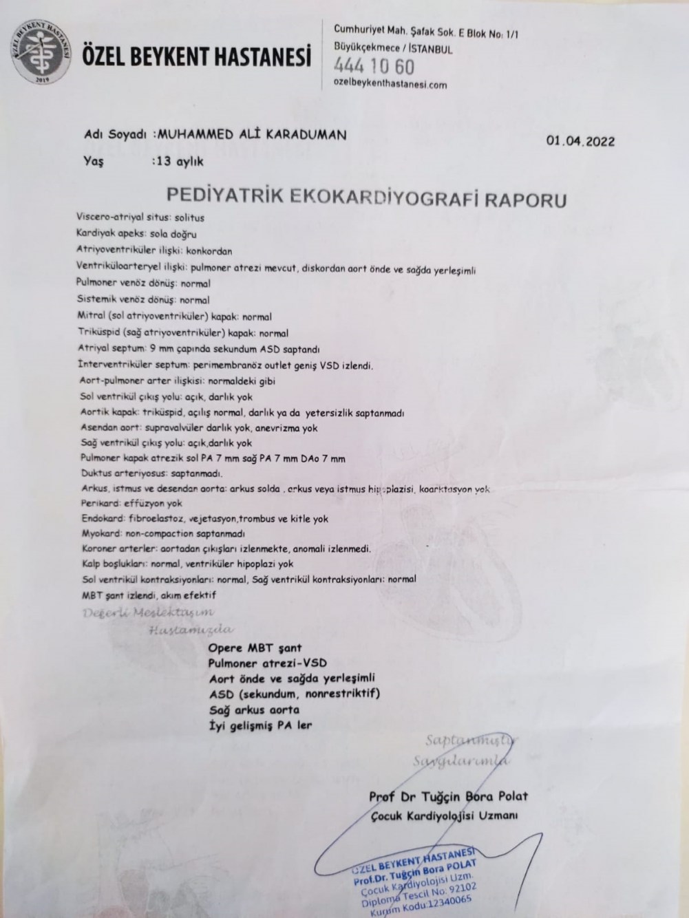 Kdz. Ereğli ilçesine bağlı Kepez Mahallesinde ikamet eden Onur ve Aysel Karaduman çiftinin 16 aylık oğulları Muhammet Ali Karaduman, konjenital kalp hastası olarak dünyaya geldi. Yaklaşık 9 ay önce 20 bin TL karşılığında ameliyatı gerçekleştirilen Muhammet bebeğin yaşama tutunması için doktorları, ikinci ameliyatın olmasına karar verdi.