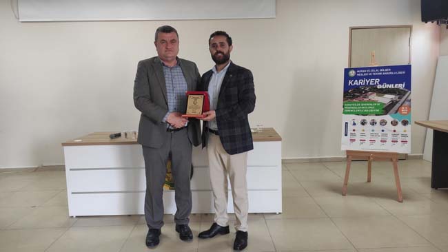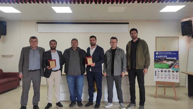 Kendi alanlarıyla ilgili olarak da bilgilendirmelerde bulunan Makine Teknikeri Hakan Döngel ve Makine Mühendisi Furkan Tiryaki'ye söyleşi sonunda katkı ve desteklerinden dolayı okul idaresi tarafından plaket takdim edilerek, günün anısına fotoğraf çektirildi.