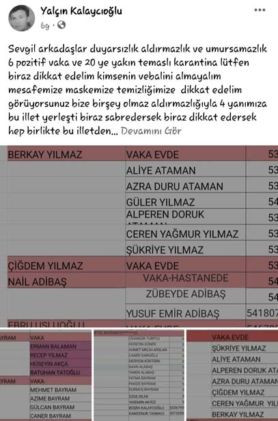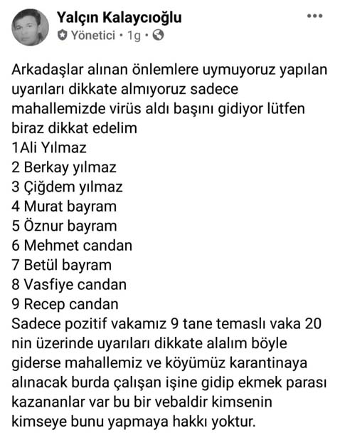 Zonguldak'ın Çaycuma ilçesi Kalaycıoğlu köyünde her geçen gün artan koronavirüs pozitif sayısı yüzünden muhtar vatandaşı sosyal medya hesabı üzerinden paylaştı.