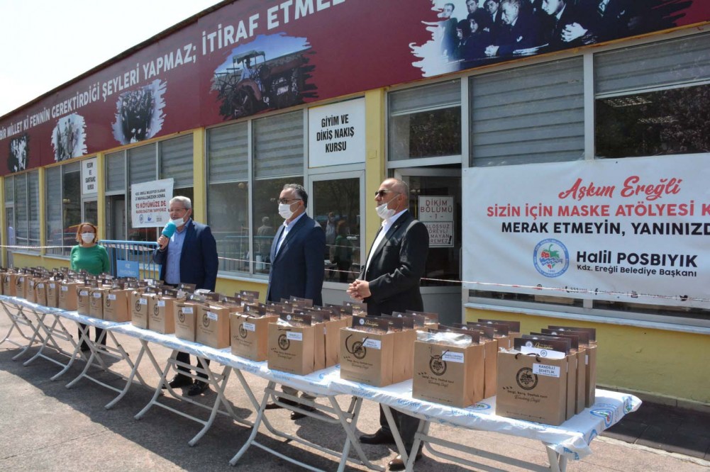 Korona virüs salgınıyla mücadele kapsamında maske üreterek halka dağıtan Kdz. Ereğli Belediyesi, 31 mahalle ve 93 köyün ardından Ormanlı, Gülüç ve Kandilli Beldelerine de maske desteğinde bulundu.