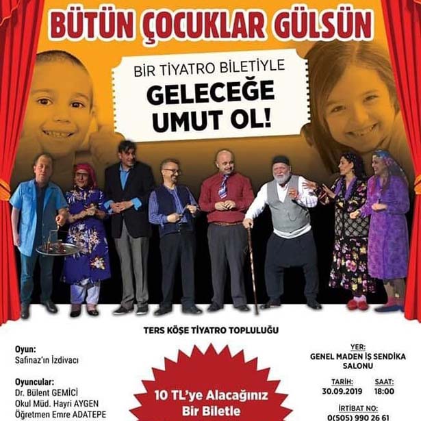 Zonguldak'ta mahalle muhtarlarının "Bütün Çocuklar Gülsün", "Bir Tiyatro Biletiyle Geleceğe Umut Ol" sloganlarıyla kampanya başlatan mahalle muhtarları, siyah önlük giyip beyaz yaka takarak Madenci Anıtı'nda buluştu. Zonguldak Muhtarlar Derneği Başkanı Şerafettin Nas'ın da destek verdiği etkinlikte Madenci Anıtı'ndan yürümeye başlayan muhtarlar Vergi Dairesi önündeki stantta bilet satışı gerçekleştirdi.