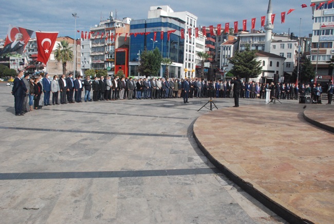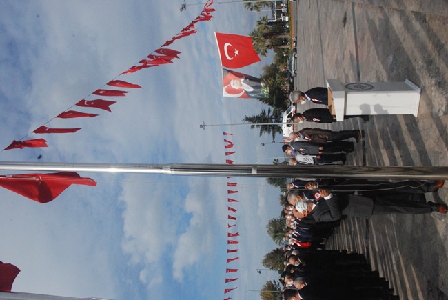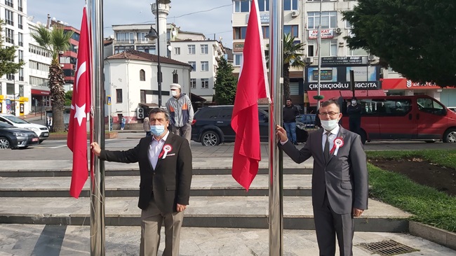 Saygı Duruşunda bulunulan törende İstiklal Marşı’nın okunması sırasında, 3 muhtar tarafından gönderlere Türk Bayrakları çekildi.