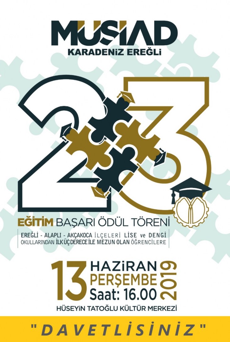 MÜSİAD Karadeniz Ereğli Şubesi tarafından, her sene geleneksel olarak Karadeniz Ereğli ve Alaplı ilçeleri Lise ve Dengi Okullarından ilk üç dereceyle mezun olan öğrencilerin ödüllendirilmesi amacıyla düzenlenen ve bu sene Akçakoca İlçeleri Lise ve Dengi Okullarının da dahil edildiği MÜSİAD Eğitim Başarı Ödül Töreni Programı'nın 23.'sü düzenleniyor. Törenin bu yılki ayağı, 13 Haziran 2019 günü gerçekleştirilecek.