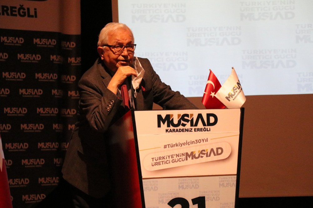 MÜSİAD Genel Başkanı Abdurrahman Kaan, yaptığı konuşmada bölgenin doğa güzelliğine ve sanayi kimliğine vurgu yaptı. Başkan Kaan konuşmasında, “Zengin kömür yatakları, demir çelik fabrikaları bunlara bağlı yan sanayiler ekonominin bel kemiği. Türkiye’nin sanayi ve doğası ile iç içe bütünlük içinde yaşadığı ender bölgelerinden birisi olan Karadeniz Ereğli’nin sanayi kimliğine rağmen güzelliğinden, estetiğinden ve doğallığından hiçbir şey kaybetmediğini de ifade edebiliriz. Geleceğin dünyasında devletler değil şehir ekonomileri yarışacaktır. Bugün baktığımızda, pek çok devletin milli gelirini katlayan iç üretim ve gayri safi yurtiçi hasılasını katlı ile öne çıkan şehirler, birer marka değeri olarak dünya global üretiminde kendi ülkelerinden bile daha fazla söz sahibi olabilmektedirler. Zonguldak ve Karadeniz Ereğli bu bağlamda hem kültürel, tarihi ve yeraltı kaynakları hem de bu kaynakları değere çevirebilme özelliği oldukça büyük bir potansiyeli barındırıyor. Her şehrin kendine özgü değerleri vardır. Doğru bir sanayileşmesi politikası belirlemek adına şehir ekonomileri oluşturmak ve bu ekonomiyi ayakta tutacak olan, gelecek vaat eden firmaları bulmak, desteklemek, ölçeklerini büyütmek, sermaye güçlerini artırmak, yerli ve milli üretim hamlesini hem şehirleri markalaştırmak hem de firmaları güçlendirmek şeklinde yapmaktan geçer. Burada Ereğli Ticaret ve Sanayi Odamıza da bizlerle beraber hareket etme konusunda görev düşüyor. Biz buna ‘sanayileşmenin icrası ve şehir ekonomilerini çalıştırmak’ diyoruz. Şimdi, Karadeniz Ereğli’nin sahip olduğu varlıklara baktığımızda da böylesi bir çalışma için ne kadar uygun ve pilot olan bir ilçemiz olduğunu da ifade etmek istiyorum. Ereğli bir ilçe olarak ilk şubemizdir ama bugün birçok projede Türkiye’ye örnek olmuştur.” İfadelerini kullandı.