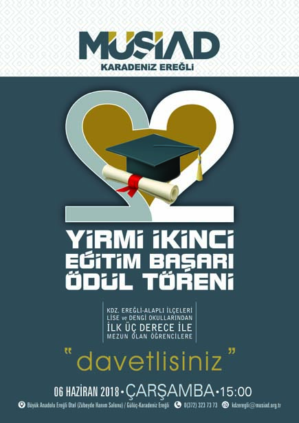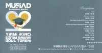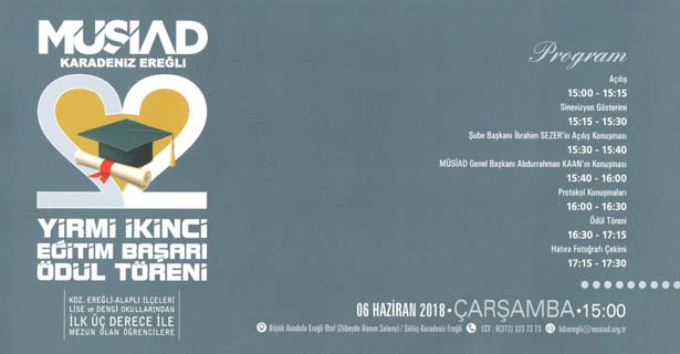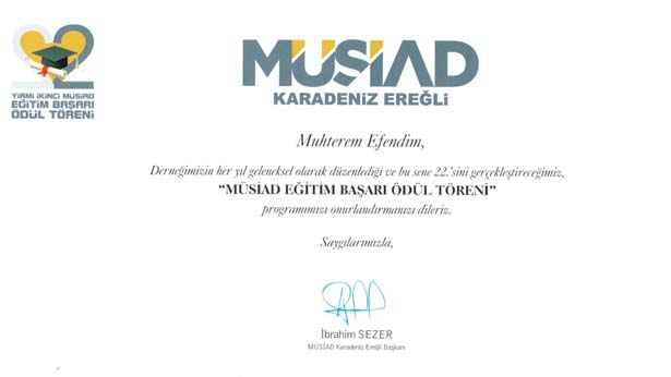 Bilgilerinize sunarken, bu sene 22. sini düzenleyecek olduğumuz MÜSİAD Eğitim Başarı Ödül Töreni programımızı şimdiden gündeminize almanızı ve katılımlarınızla bizleri onurlandırmanızı bekler, çalışmalarınızda kolaylıklar ve başarı dileriz."