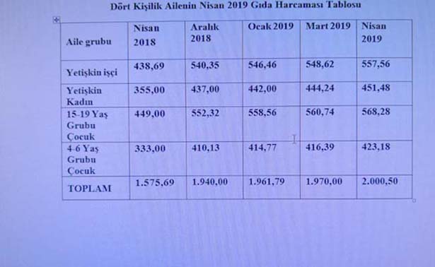 Genel Maden İşçileri Sendikasının her ay yaptığı 1 çalışan, bir ev hanımı eş ve 2 çocuktan oluşan çekirdek madenci ailesini kapsayan Gıda Harcaması Araştırmasını oluşturan harcama gruplarında Nisan 2019 da şu değişimler gözlemlendi.