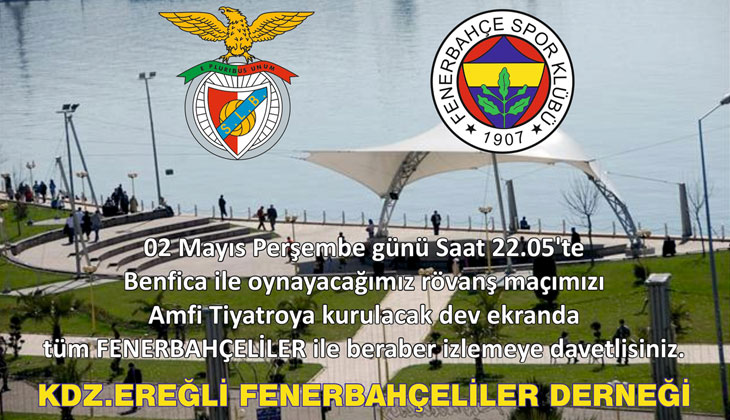 Benfica ile oynayacağımız maç günü saat 22.05'de Amfi Tiyatro'ya dev ekran kurulacağı bildirildi. Ereğli Fenerbahçeliler Derneği Başkanı Aşkın Peker, Belediye Başkanı Halil Posbıyık'ın da izleyeceği büyük maç için tüm taraftarlara çağrıda bulunarak maçın izleneceği Amfi Tiyatroya herkesi davet etti...
