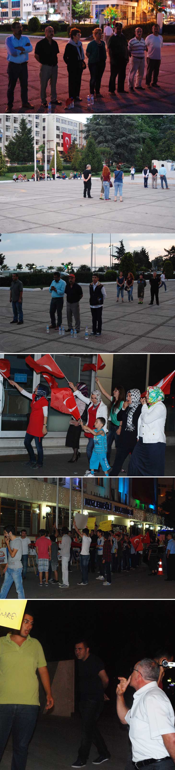 Diğer taraftan tüm bu gelişmeler yaşanırken; İş Bankası Önünde toplanan yaklaşık 150 kadar 'Gezi' destecisi gurup, Anıt Önünde ki diğer karşı gurupla karşılaşmamaları için sahil boyunca yürüyüşlerine devam ettiler. AK Parti ve Başbakan Recep Tayyip Erdoğan aleyhine slogan atan gurup, Çınaraltı Bozhane kafeye geldiğinde İstiklal Marşını okuduktan sonra olaysız bir şekilde dağıldı.