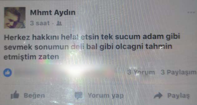 Edinilen bilgiye göre olay, Şamlar Köyü Esentepe Mahallesi'nde meydana geldi. 22 yaşındaki M.A. yaklaşık 1 yıl önce askerden döndü ve bayan kuaförde çalışan sevgilisi M.A. ile 2 ay önce nişanlandı. Temmuz ayında düğün yapmayı planlayan M.A. , evleneceği M.A. ile birlikte yaşamayı planladığı evi kiralayıp düğün hazırlıklarına başladı. Bir süredir geçinemeyen gençlerden M.A. bir hafta kadar önce nişan yüzüğünü atarak evlilikten vazgeçti. Nişanlısının kendisini terk etmesini kabullenemeyen A., geçtiğimiz Pazar günü ilaç içerek intihar etmeye çalıştı ancak yakınları tarafından hastaneye kaldırılarak kurtarıldı. M.A. bu gün öğlen Cuma namazını kıldıktan sonra sosyal paylaşım sitesi facebooktaki adresinden "Herkes hakkını helal etsin. Tek suçum adam gibi sevmek. Sonumun deli bal gibi olacağını tahmin etmiştim zaten" notunu paylaşınca yakınları kendisini aramaya başladı.