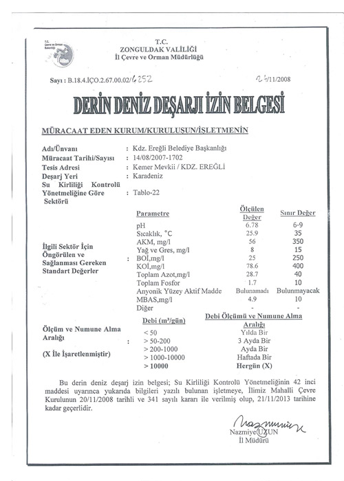 Kdz Ereğli Belediyesine ait Derin Deniz Deşarj Sistemi projesi de İstanbul Teknik Üniversitesi (İTÜ) tarafından hassas bir şekilde hazırlanmış olup, İller Bankası tarafından uygulanmış ve Belediyemiz tarafından da günümüz teknolojileri kullanılarak geliştirilmiştir.