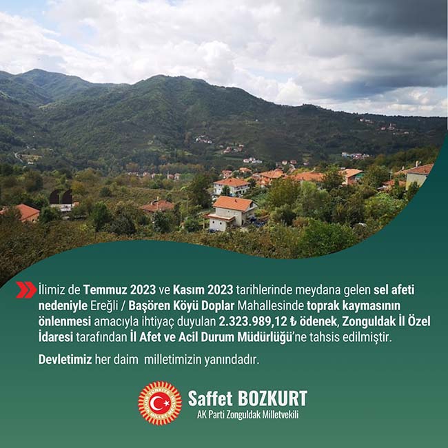 “İlimiz de Temmuz 2023 ve Kasım 2023 tarihlerinde meydana gelen sel afeti nedeniyle Ereğli / Başören Köyü Doplar Mahallesinde toprak kaymasının önlenmesi amacıyla ihtiyaç duyulan 2.323.989.12 TL ödenek, Zonguldak İl Özel İdaresi tarafından İl Afet ve Acil Durum Müdürlüğü’ne tahsis edilmiştir.