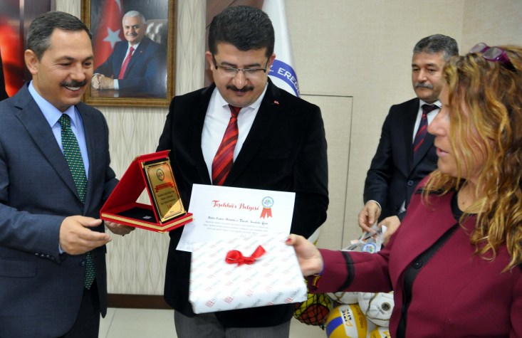 Dereceye giren okullarının hediyelerini ve teşekkür belgelerini okul müdürleri Başkan Uysal'ın elinden aldı.