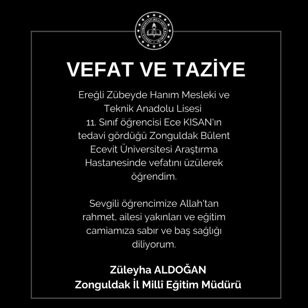 “Ereğli Zübeyde Hanım MTAL 11. sınıf öğrencimiz Ece KISAN’ın tedavi gördüğü Zonguldak Bülent Ecevit Üniversitesi Araştırma Hastanesinde vefatını üzülşerek öğrendik. Sevgili öğrencimize Allah’tan rahmet, ailesi, yakınlarına ve eğitim camiamıza sabır ve baş sağlığı dileriz.”
