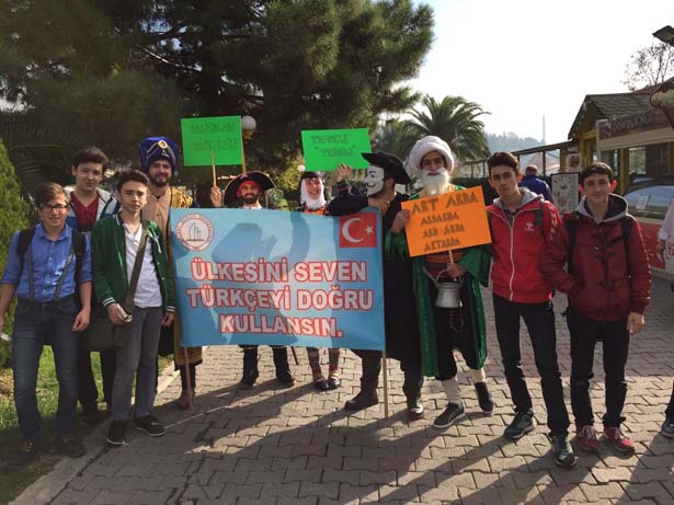 yürüyen öğrenciler, vatandaşlara Türkçe'nin doğru kullanımını anlatmaya çalıştı.