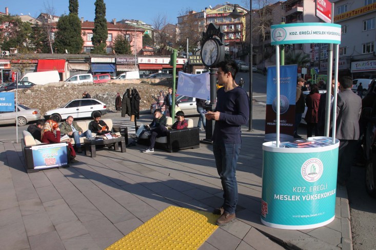 Ereğli Meslek Yüksek Okulu (EMO) Deniz ve Liman İşletmeciliği Bölümü 3'üncü sınıf öğrencileri Sosyal Sorumluluk Dersi kapsamında beraberinde getirdikleri kitapları, şehrin merkezine koydukları koltuk takımına oturarak okudu. Bazı vatandaşlar öğrencileri şaşkın bakışlarla incelerken, bazıları da olayın ne olduğunu anlamak için öğrencilerden bilgi almaya çalıştı. Vatandaşlardan bir tanesi, öğrencilerden bilgi alırken, gazetecilerin 'kitap okuyor musunuz' sorusuna fazla değil diye cevap verirken 'Son olarak hangi kitabı okudunuz' sorusunu ise 'Valla ne yalan söyleyeyim şimdi. Ben kitap okumuyorum. Kitap okumaya işlerden vakit bulamıyoruz' cevabını vererek uzaklaştı.