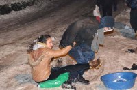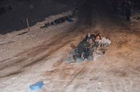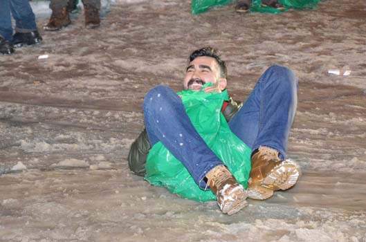 gençler düşmekten kurtulamadı. Poşetleri kızak olarak kullanan öğrenciler