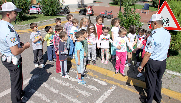 Karşıdan karşıya nasıl geçilir, çocukların arabada nerede oturacağı, trafik işaretlerinin ne anlama geldiği konularında ders veren Polis Memuru Fikret Karakuş, daha sonra çocuklara anlattığı konuları uygulamalı olarak gösterdi. Uygulamalı Eğitimde Trafik Polisleri Kenan Ulukaya ile Mustafa Özgül' de miniklere karşıdan karşıya nasıl geçecekleri konusunda ders verdi.