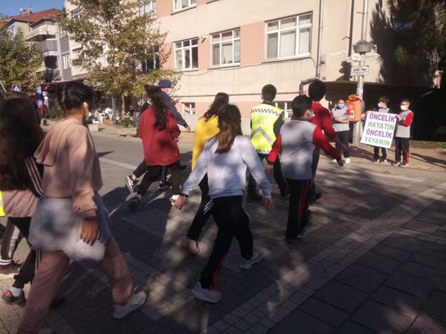 Yaya geçidinde durarak sürücüleri bilgilendiren öğrencilere, trafik polisi ve jandarma trafik ekipleri de eşlik etti.